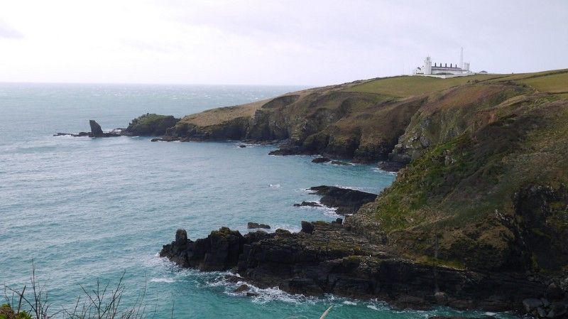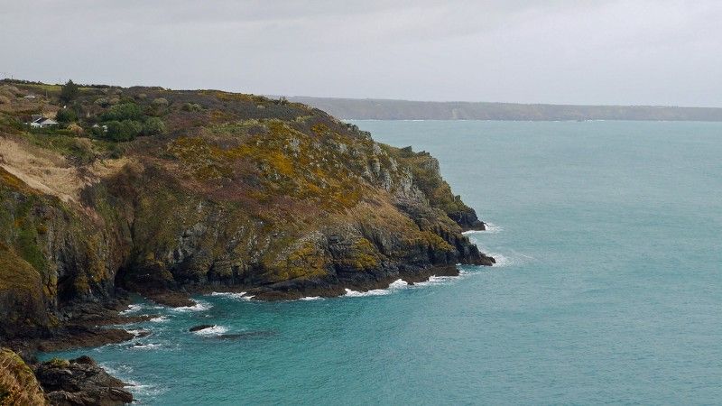 Our first day’s walk took us east from Lizard Point to Coverack, 10 miles away. Here’s a shot looking back shortly after the start of the walk, to see the lighthouse and youth hostel from behind, and the spur of land they sit on.